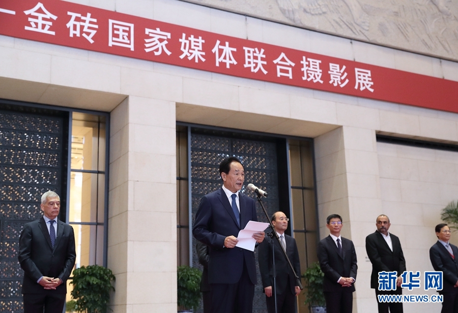 ??? 6月7日,金磚國家媒體聯(lián)合攝影展在北京中國國家博物館開幕,由金磚五國主流媒體共同提供的170余幅圖片與公眾見面,全面展示了金磚國家合作的豐碩成果。這是新華社社長蔡名照在攝影展開幕式上致辭。新華社記者 王曄 攝