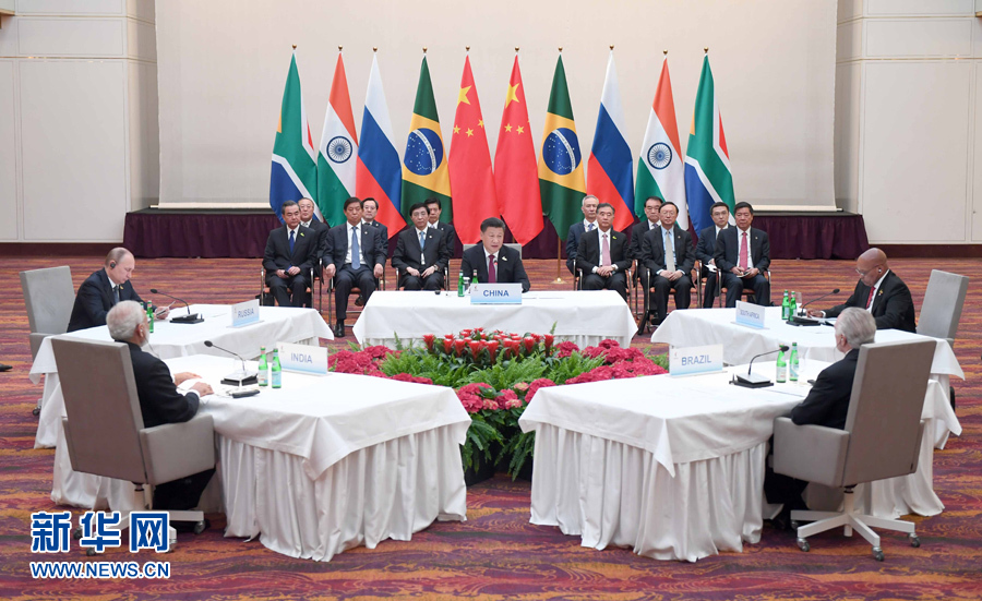 ??? 7月7日,國家主席習近平在德國漢堡主持金磚國家領導人非正式會晤,發表引導性講話和總結講話。南非總統祖馬、巴西總統特梅爾、俄羅斯總統普京、印度總理莫迪出席。新華社記者 張鐸 攝