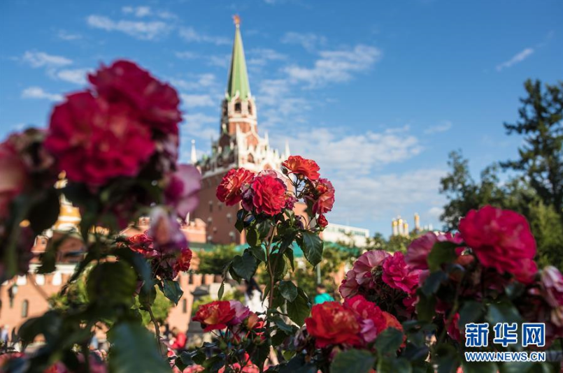 這是2017年7月19日在俄羅斯莫斯科拍攝的克里姆林宮外盛開的鮮花。