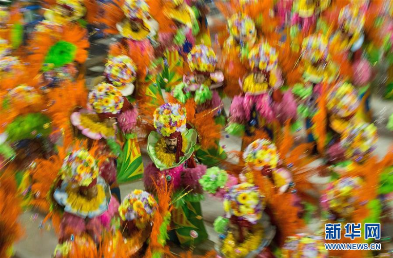 這是2017年2月26日晚,在巴西里約熱內盧,最能代表里約狂歡節水平的特級組桑巴舞校表演者參加巡游活動,舞者的配飾和旋轉的舞步仿佛雨天怒放的花朵。