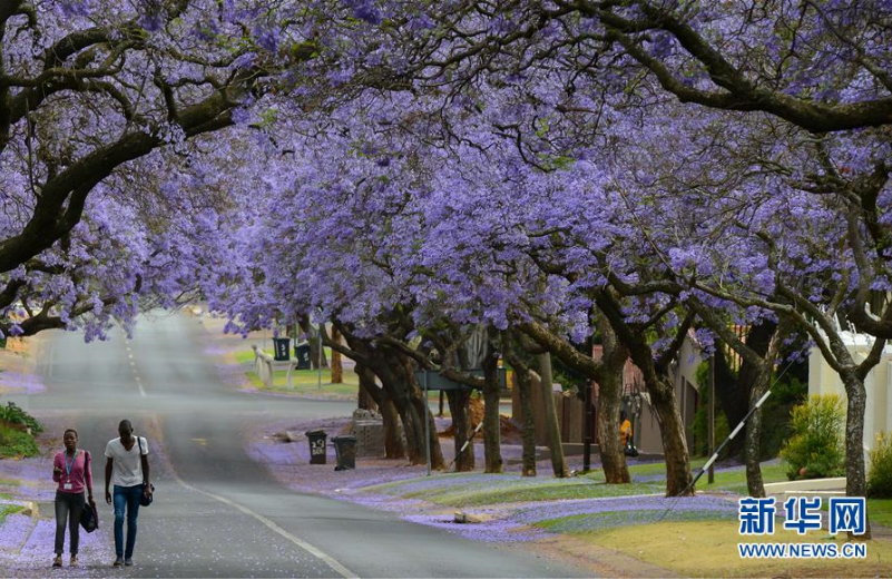 這是2014年10月15日,在南非比勒陀利亞,行人從藍花楹樹下走過。每年十月,種植有八萬多株藍花楹樹的比勒陀利亞都會成為一片紫色的海洋,故有“藍花楹之城”美譽。