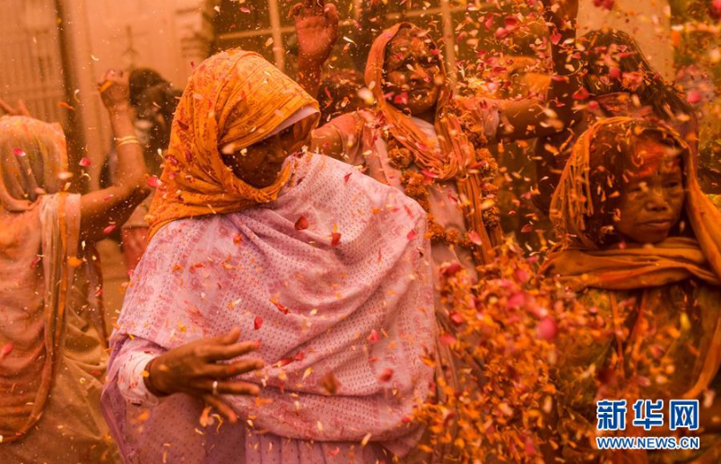 這是2016年3月21日,在印度北方邦印度教圣城沃林達文,參加灑紅節慶?;顒拥膵D女拋撒金盞花和其他花朵的花瓣。金盞花被印度人尊奉為“神圣的花”。