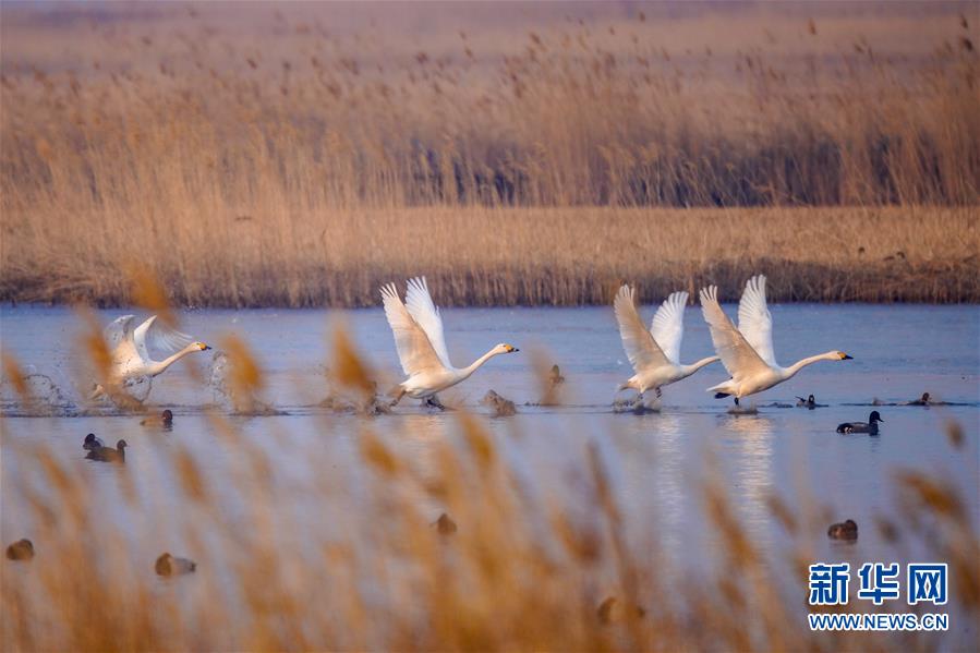 4月9日,在位于吉林省白城市鎮賚縣的莫莫格國家級自然保護區,天鵝從濕地上起飛。 隨著氣溫回暖,位于吉林省白城市鎮賚縣境內的莫莫格國家級自然保護區迎來候鳥北歸高峰期。近兩千只白鶴,數萬只大雁、野鴨等在此停歇休養,補給覓食。 新華社記者 張楠 攝