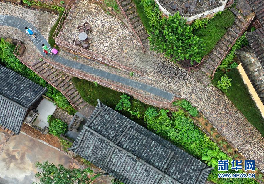7月11日,游客行走在金秀瑤族自治縣六巷鄉一處民宿內(無人機照片)。 近年來,廣西金秀瑤族自治縣依托當地自然生態優勢,圍繞境內豐富的瑤族文化,大力發展鄉村旅游,精心打造一批獨具瑤族特色的山間民宿酒店,取得良好經濟效益。 新華社記者 周華 攝