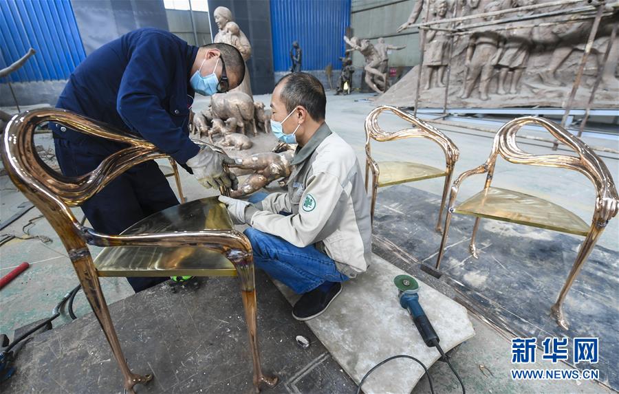7月13日,工人在華日青銅文化產業園車間焊接青銅工藝品。 河北省饒陽縣華日青銅文化產業園是華北地區重要的青銅雕塑文化產業基地。復工復產以來,該基地獲得的海外訂單不斷增加,目前已增至總訂單的50%。 新華社記者李曉果攝