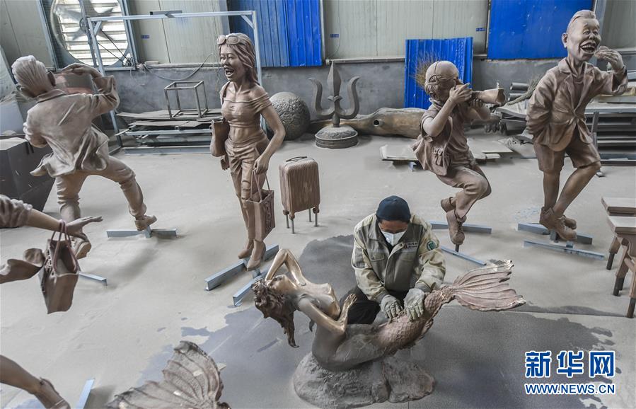 7月13日,工人在華日青銅文化產業園車間打磨青銅工藝品。 河北省饒陽縣華日青銅文化產業園是華北地區重要的青銅雕塑文化產業基地。復工復產以來,該基地獲得的海外訂單不斷增加,目前已增至總訂單的50%。 新華社記者李曉果攝