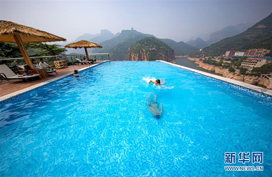 7月15日,游客在武安市活水鄉(xiāng)松林山莊民宿內(nèi)游泳。 新華社記者 王曉 攝