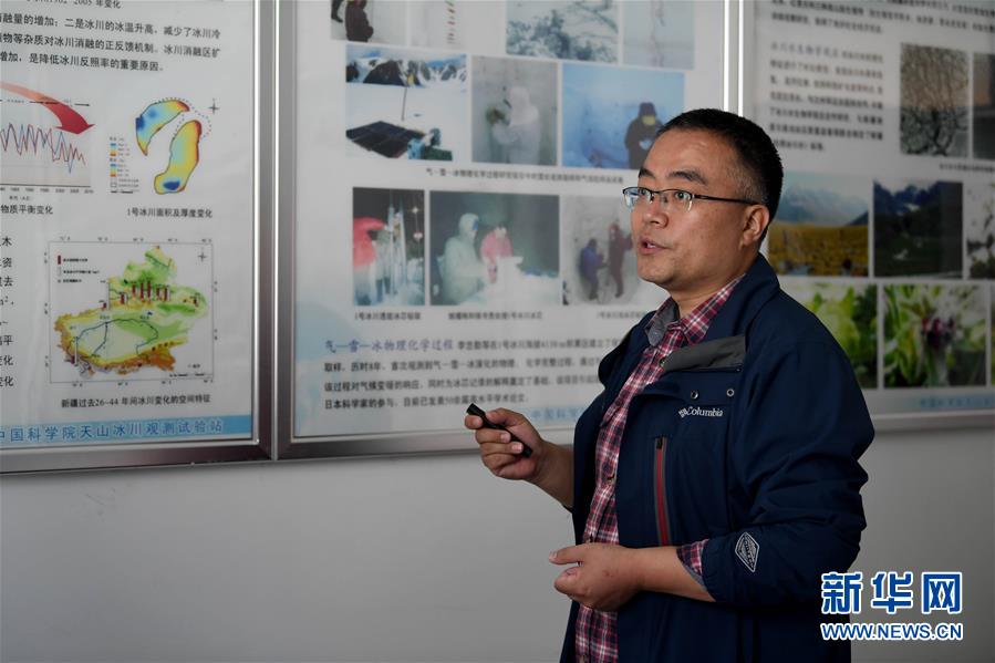 7月16日,中國科學院西北生態環境資源研究院天山冰川觀測試驗站工程師周平介紹天山一號冰川情況。 新華社記者 沙達提 攝