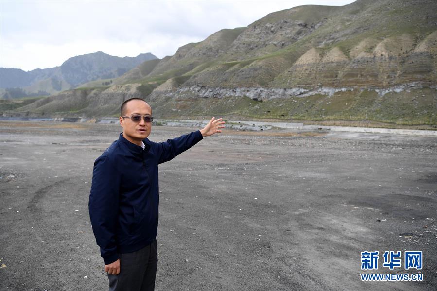7月16日,烏魯木齊市生態環境局烏魯木齊縣分局局長嚴偉濤介紹一家企業的礦坑被回填的情況。 新華社記者 沙達提 攝