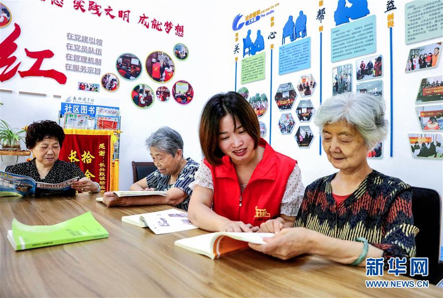 7月20日,在臺苑新村社區(qū)圖書閱覽室里,宣講員給小區(qū)居民講解老年人權益保障法的相關條例。新華社記者 徐昱 攝