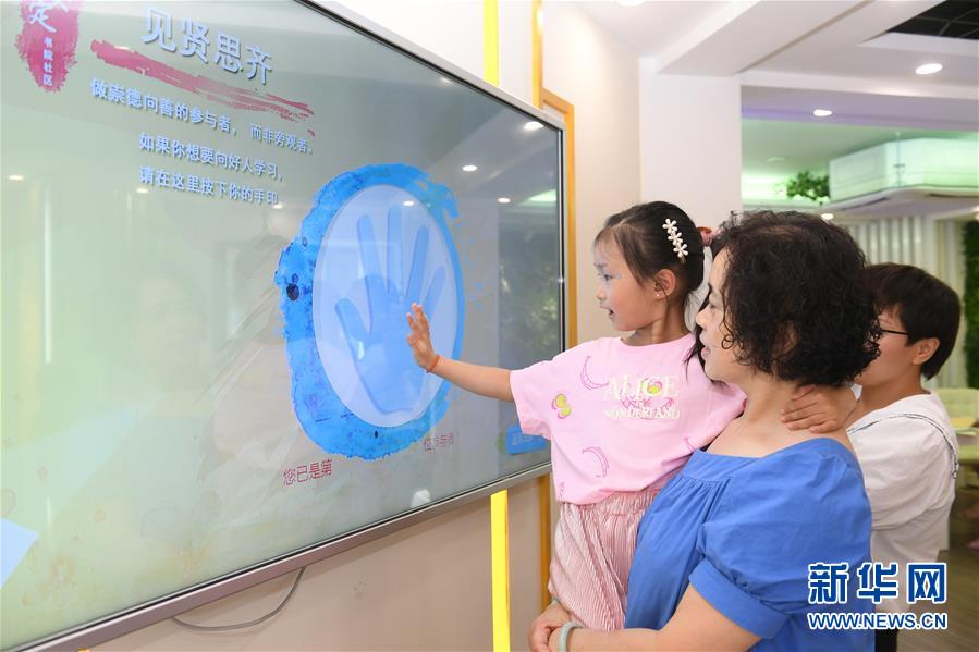 7月21日,家長帶著小朋友在安定書院社區“好人館”按手印參與好家風活動。 當日,浙江省湖州市吳興區愛山街道安定書院社區開展“聽爺爺奶奶講家風”活動,讓社區的青少年了解家風文化。 新華社記者 翁忻旸 攝