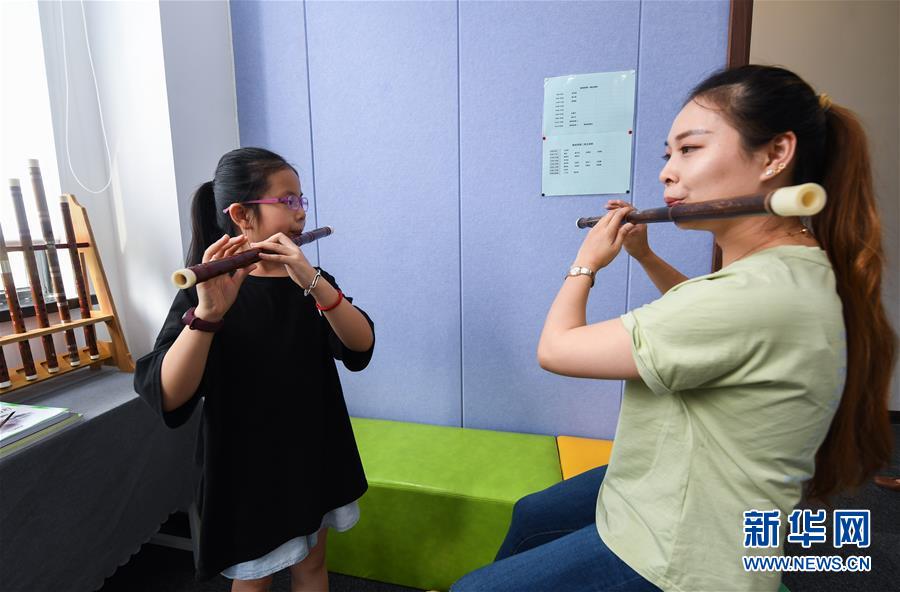 7月23日,黃毓(右)在自己的笛子培訓工作室內給一名小學員上課。