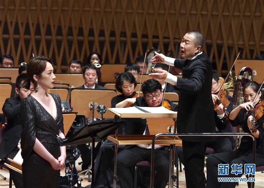 7月29日晚,作曲家譚盾(前右)在2020上海夏季音樂節閉幕音樂會上指揮。 新華社記者 任瓏 攝