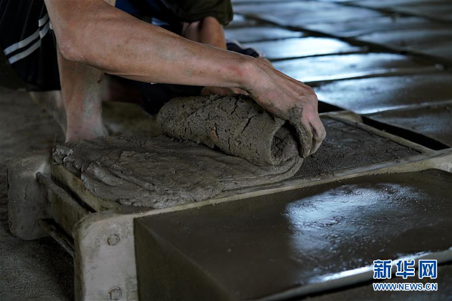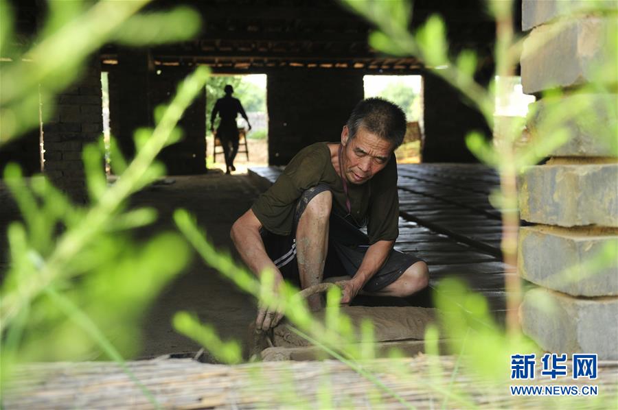 7月30日,河北省任丘市出岸鎮古建磚廠工人在制作磚坯。 新華社記者 牟宇 攝