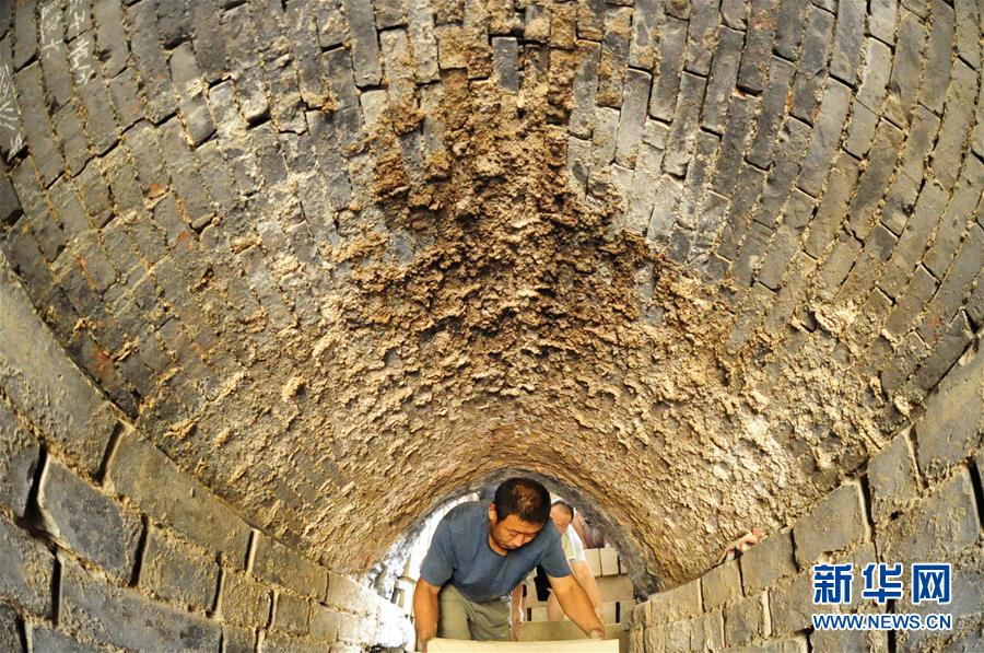 7月30日,河北省任丘市出岸鎮古建磚廠工人將磚坯裝窯以備燒制。 新華社記者 牟宇 攝