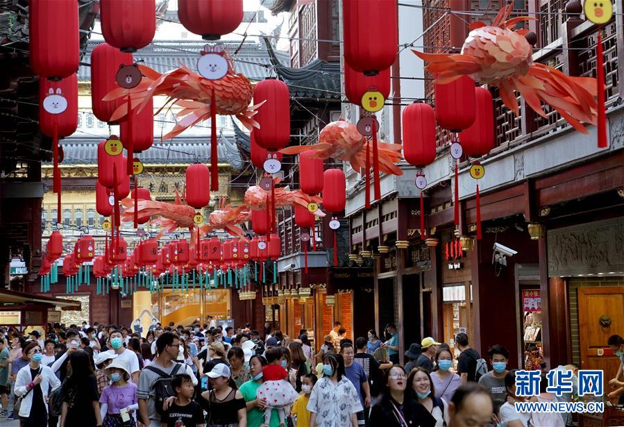 8月1日,上海豫園的燈籠上裝飾著布朗熊等卡通形象。 進入8月,上海豫園進入“暑期檔”。卡通形象布朗熊、可妮兔等亮相豫園,為熱鬧的市集增添了童趣;清涼噴霧、文創冰品等為游客在酷暑中送上清涼。 新華社記者 劉穎 攝