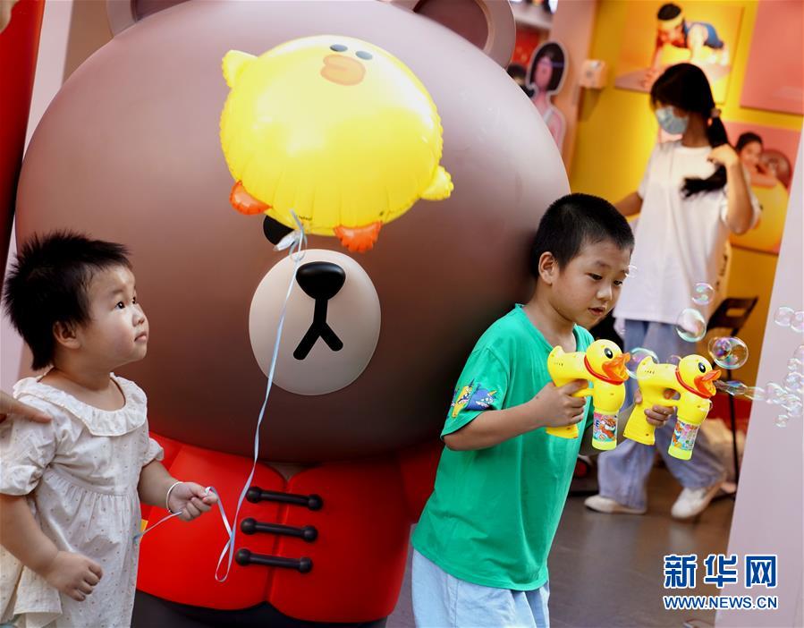 8月1日,小游客在上海豫園與布朗熊玩偶合影。 進(jìn)入8月,上海豫園進(jìn)入“暑期檔”。卡通形象布朗熊、可妮兔等亮相豫園,為熱鬧的市集增添了童趣;清涼噴霧、文創(chuàng)冰品等為游客在酷暑中送上清涼。 新華社記者 劉穎 攝