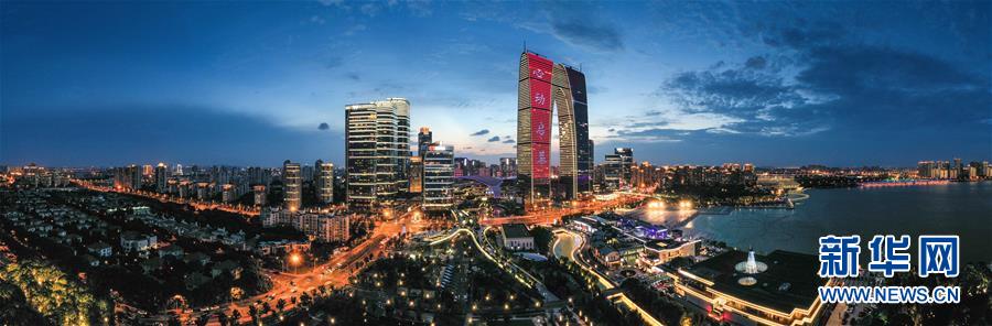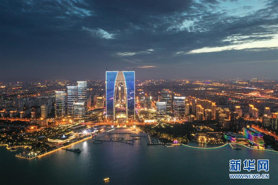 夏夜的蘇州金雞湖畔景色迷人,城市景觀照明燈火璀璨,夜色中的蘇州美不勝收。新華社記者 李博 攝