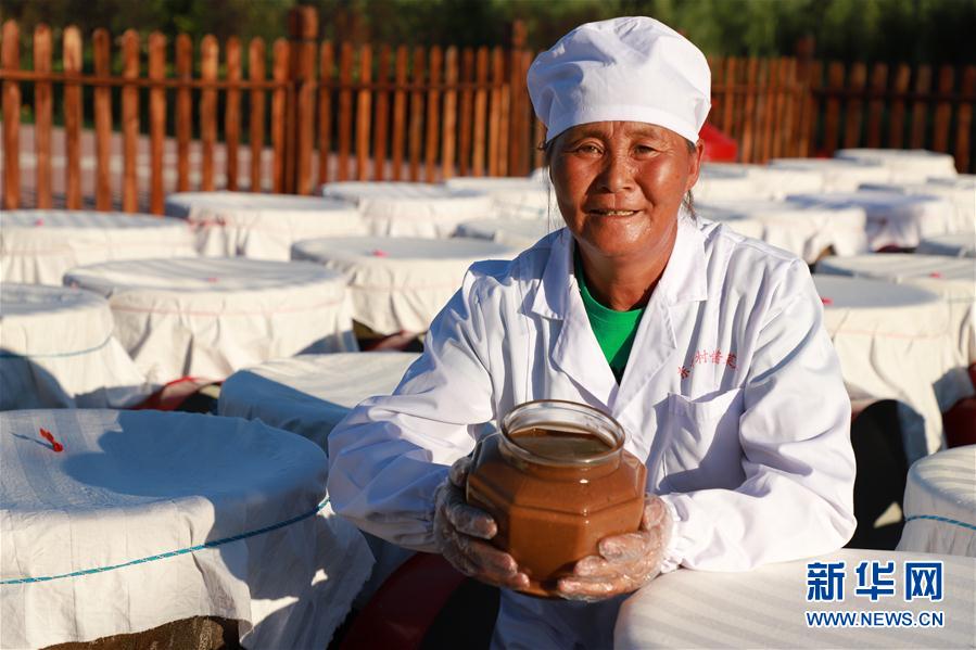 黑龍江省綏化市青岡縣蘆河鎮東升村村民李淑琴在展示醬廠生產的大醬(7月21日攝)。 新華社記者 徐凱鑫 攝