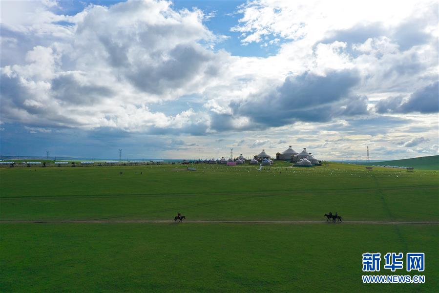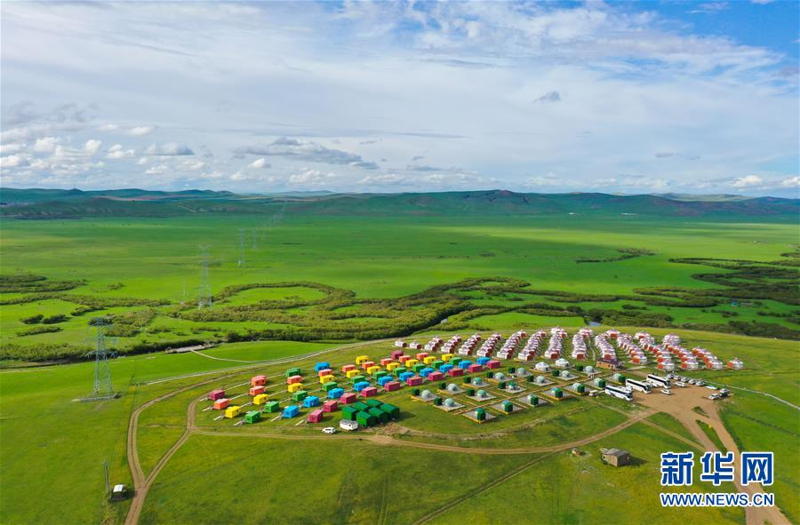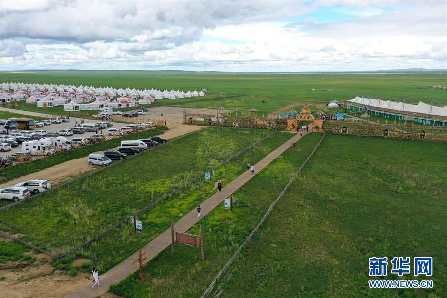 8月4日,游客在呼倫貝爾新巴爾虎左旗的民俗旅游度假景區游玩(無人機照片)。 今年暑期,內蒙古呼倫貝爾通過暫行周末2.5天彈性休假工作制度,發放旅游、餐飲消費券,景區推出優惠促銷活動等措施,提振當地旅游市場。 新華社記者 徐欽 攝