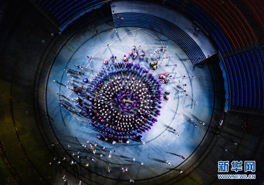 演員在苗族大型山水實景演出《西江盛典》中表演(7月30日攝,無人機照片)。新華社記者 陶亮 攝