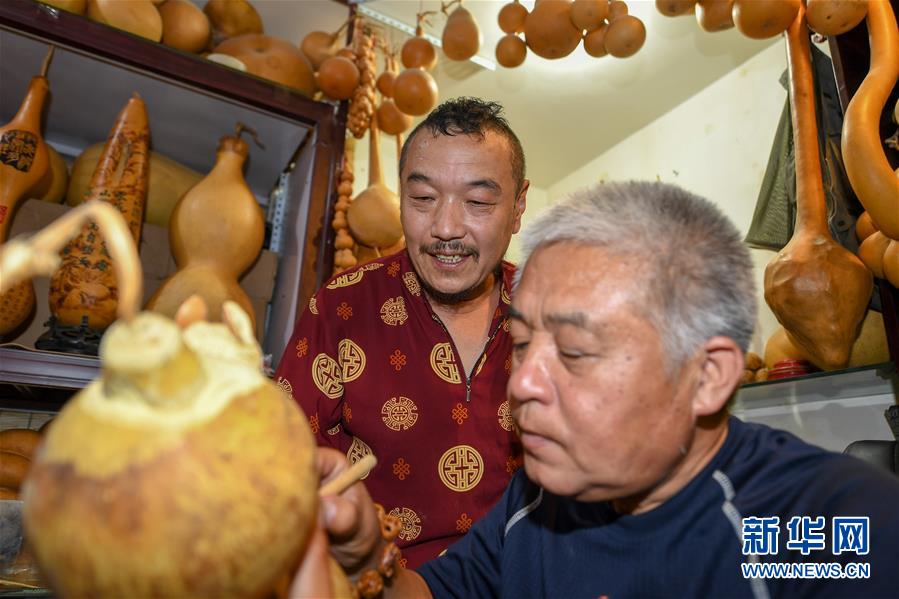 8月5日,侯景偉(左)向徒弟金志勇傳授技藝。 今年55歲的吉林四平人侯景偉自幼與家人學習雕刻、烙畫藝術。經過多年潛心研究,他將浮雕和烙畫工藝相結合,通過拋光、起稿、雕刻、烙燙、套色等十余道工藝,制作展現傳統文化、民俗故事的葫蘆工藝品。2020年,侯景偉被評為四平市非物質文化遺產項目侯氏葫蘆雕刻烙畫代表性傳承人。他說:“希望有更多人加入到非遺傳承隊伍中,讓小葫蘆‘講’出更多民俗故事。” 新華社記者 張楠 攝