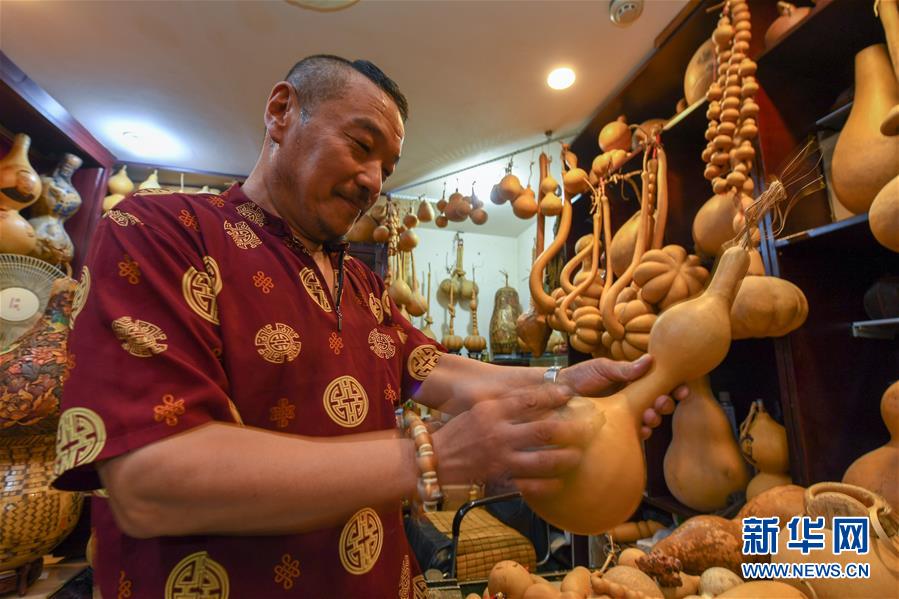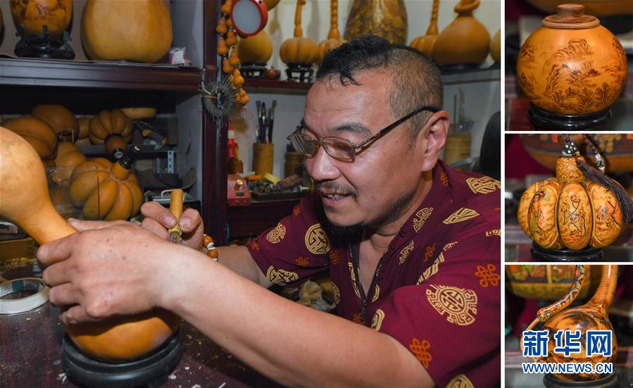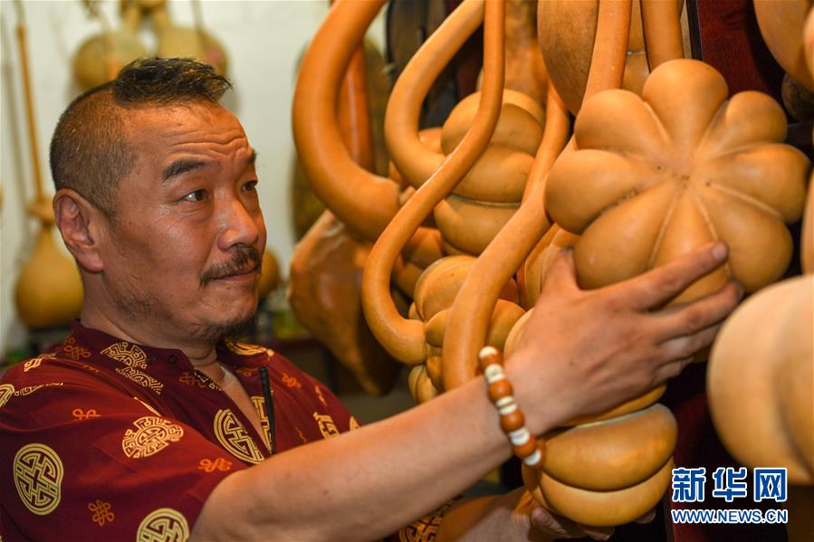 8月5日,侯景偉挑選適合創作的葫蘆。 今年55歲的吉林四平人侯景偉自幼與家人學習雕刻、烙畫藝術。經過多年潛心研究,他將浮雕和烙畫工藝相結合,通過拋光、起稿、雕刻、烙燙、套色等十余道工藝,制作展現傳統文化、民俗故事的葫蘆工藝品。2020年,侯景偉被評為四平市非物質文化遺產項目侯氏葫蘆雕刻烙畫代表性傳承人。他說:“希望有更多人加入到非遺傳承隊伍中,讓小葫蘆‘講’出更多民俗故事?!?新華社記者 張楠 攝