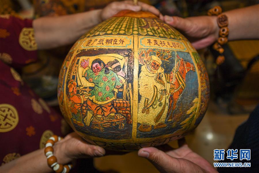 這是侯景偉創作的民俗主題葫蘆工藝品(8月5日攝)。 今年55歲的吉林四平人侯景偉自幼與家人學習雕刻、烙畫藝術。經過多年潛心研究,他將浮雕和烙畫工藝相結合,通過拋光、起稿、雕刻、烙燙、套色等十余道工藝,制作展現傳統文化、民俗故事的葫蘆工藝品。2020年,侯景偉被評為四平市非物質文化遺產項目侯氏葫蘆雕刻烙畫代表性傳承人。他說:“希望有更多人加入到非遺傳承隊伍中,讓小葫蘆‘講’出更多民俗故事?!?新華社記者 張楠 攝