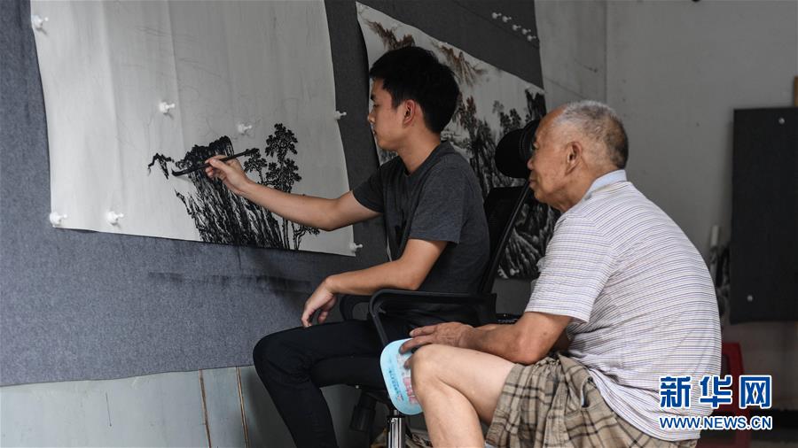 8月6日,在桂林市臨桂區五通鎮,一位老人在觀摩年輕畫師的筆法。 近年來,廣西桂林市臨桂區五通鎮以“公司+貧困戶+畫師”的模式,大力推動“農民畫”產業發展。目前,五通鎮“農民畫”從業者已達5000多人,“農民畫”已成為當地農民增收的新產業。 新華社記者 張愛林 攝