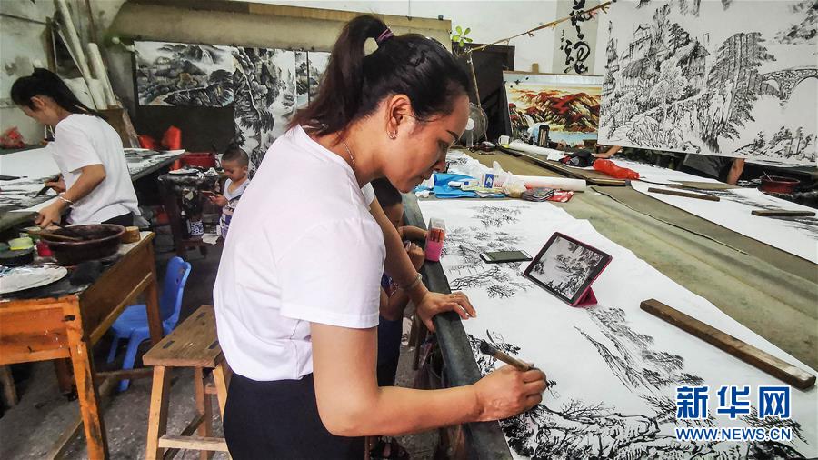這是桂林市臨桂區五通鎮農民制作的“農民畫”(8月6日攝)。 近年來,廣西桂林市臨桂區五通鎮以“公司+貧困戶+畫師”的模式,大力推動“農民畫”產業發展。目前,五通鎮“農民畫”從業者已達5000多人,“農民畫”已成為當地農民增收的新產業。 新華社記者 張愛林 攝
