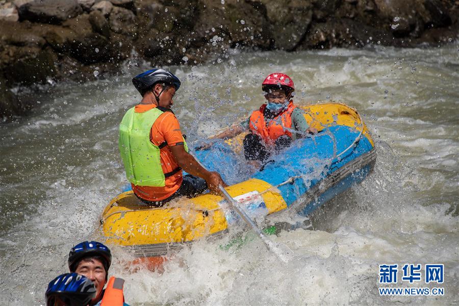 8月9日,小游客在特護員陪護下在朝天吼漂流景區漂流。 近日,湖北A級景區對全國游客免門票開放,興山縣朝天吼漂流景區的免費漂流項目吸引不少游客。景區采取錯峰調配,高密度增派安全救生員等措施,保障漂流體驗安全舒適。 新華社記者 杜華舉 攝