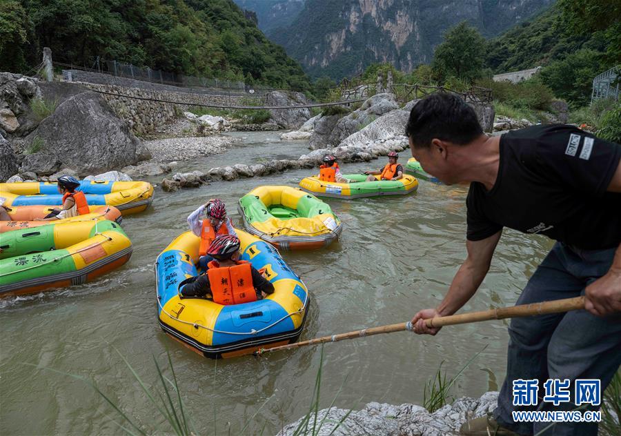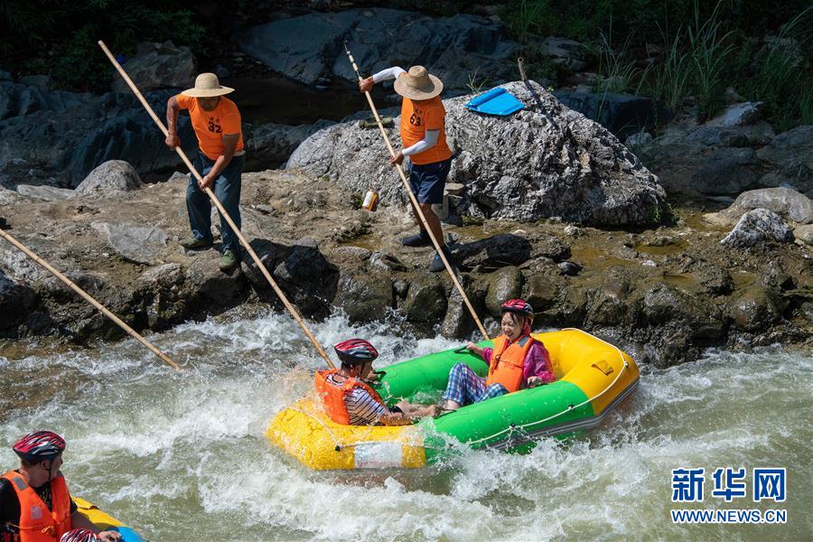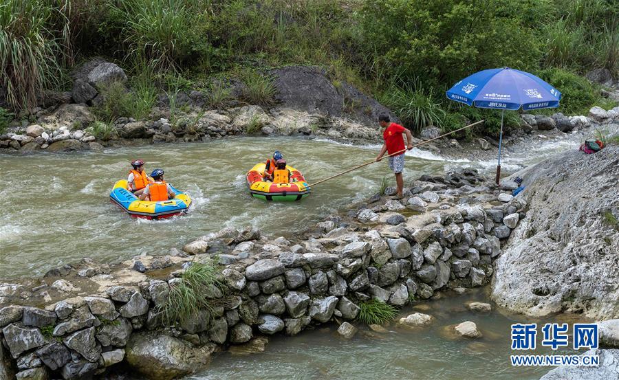 8月9日,安全救生員在朝天吼漂流景區指引游客漂流。 近日,湖北A級景區對全國游客免門票開放,興山縣朝天吼漂流景區的免費漂流項目吸引不少游客。景區采取錯峰調配,高密度增派安全救生員等措施,保障漂流體驗安全舒適。 新華社記者 杜華舉 攝
