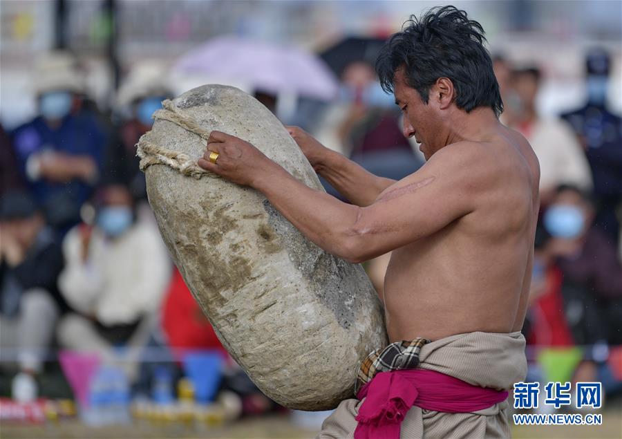 8月10日,那曲市索縣選手拉巴次仁在抱石頭比賽中抱起170公斤的石頭。新華社記者 張汝鋒 攝