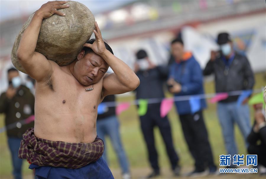 8月10日,那曲市索縣選手土多在抱石頭比賽中。新華社記者 張汝鋒 攝