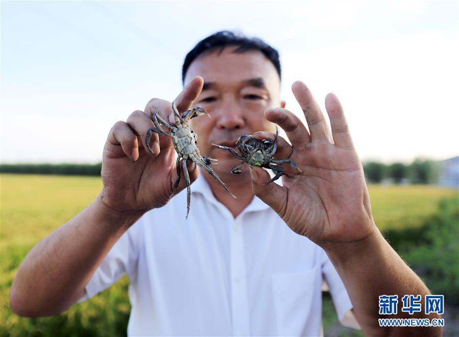 8月12日,春華村黨支部書記董為春展示從水稻田中捕撈的稻田蟹。 近年來,吉林省洮南市福順鎮春華村在脫貧攻堅工作中堅持以特色產業扶貧為重點,推動稻田養蟹特色種養殖、手工藝草編等扶貧項目發展,通過合作社等形式構建精準防返貧長效機制,幫助困難群眾實現穩定增收。 新華社記者 雒圓 攝