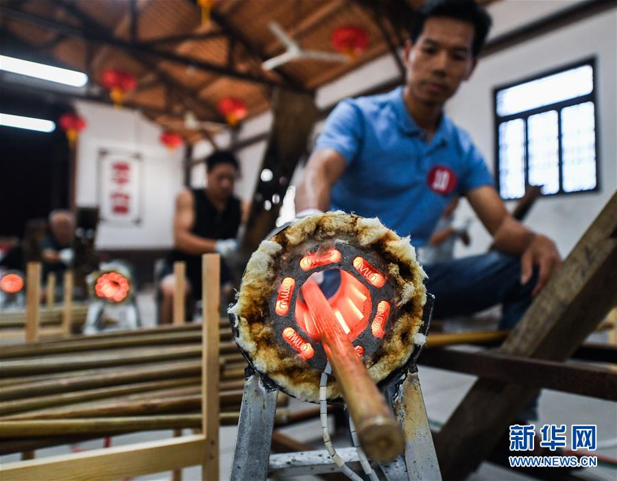 8月13日,參賽的制笛匠人將竹子毛料進行烘烤,去除水分的同時也讓竹料變軟。新華社記者 徐昱 攝