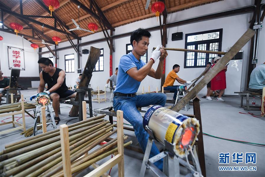 8月13日,參賽的制笛匠人將竹子毛料撬直。新華社記者 徐昱 攝