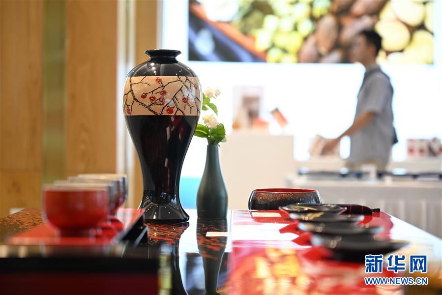 這是現(xiàn)場展出的漆器作品《荷塘小趣》(8月15日攝)。 新華社記者林善傳攝