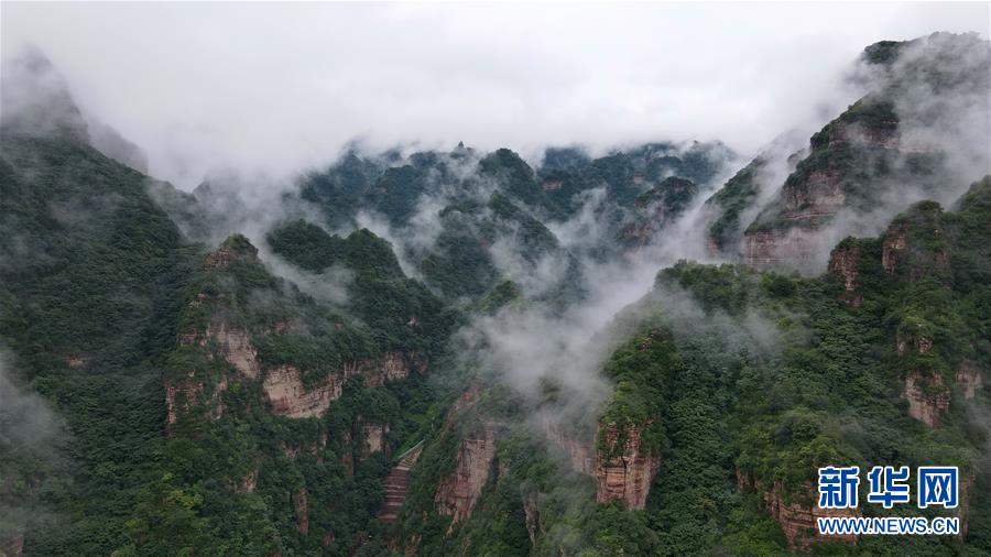 8月15日拍攝的紫金山景區(qū)(無(wú)人機(jī)照片)。 當(dāng)日,位于河北省邢臺(tái)市西部太行山脈的紫金山景區(qū)云霧彌漫,美景如畫(huà)。 新華社記者 牟宇 攝