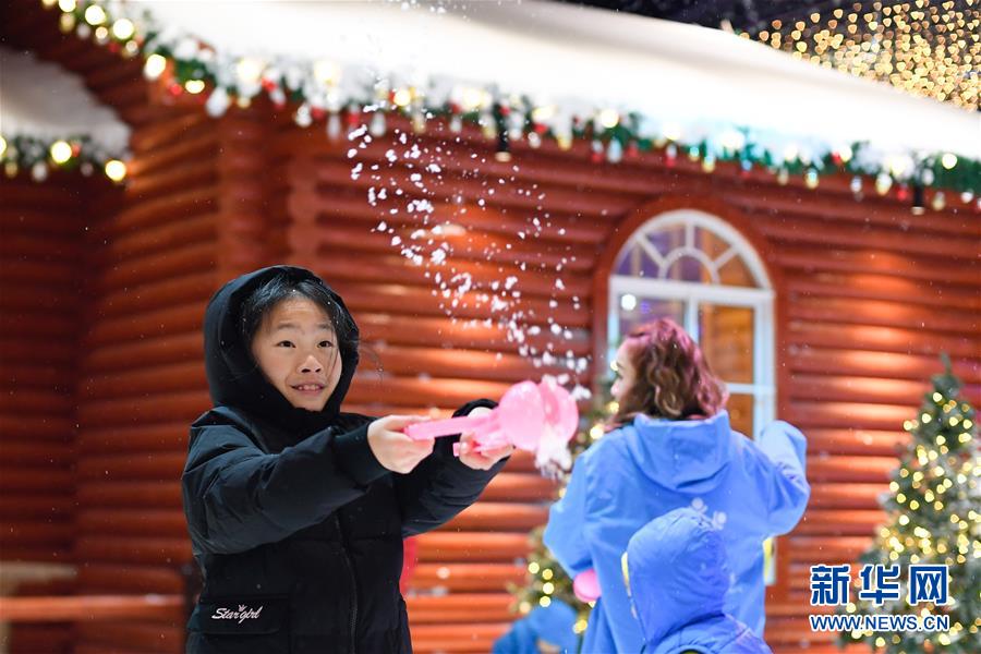 8月16日,小朋友在梅山灣冰雪大世界主題樂園里嬉戲。 近日,浙江遭遇連續高溫天氣,不少游客來到寧波市北侖區梅山灣冰雪大世界主題樂園休閑避暑。 新華社記者 黃宗治 攝
