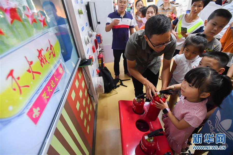 8月18日,在長沙市長沙縣星沙街道消防安全科普教育館,小朋友在體驗模擬滅火器滅火。 暑假期間,湖南省長沙市長沙縣星沙街道松雅社區組織小朋友參加消防安全科普教育活動,通過體驗VR火場逃生、高空緩降、模擬滅火等方式學習消防安全知識,提高安全意識和避險能力。 新華社記者 陳澤國 攝
