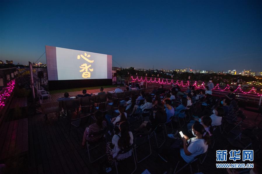 8月24日,觀眾在南鑼書店露臺欣賞露天電影。 新華社記者 陳鐘昊 攝