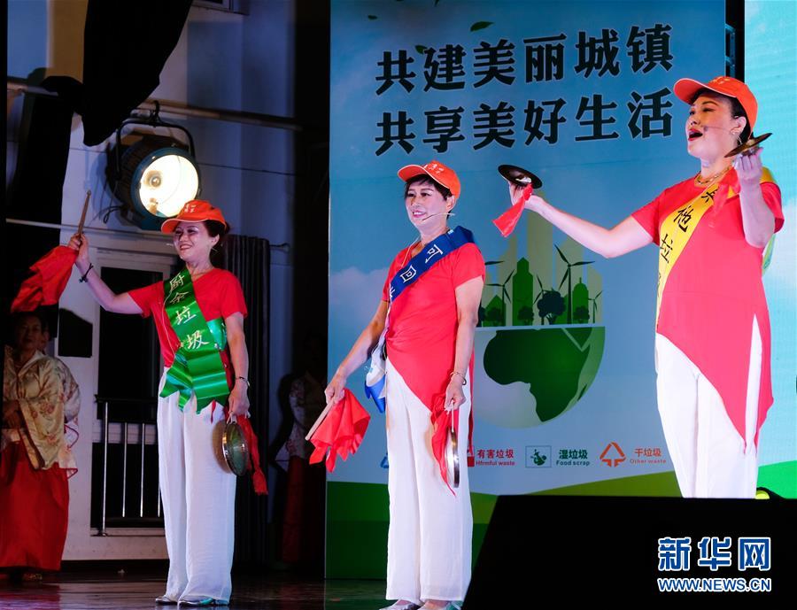 8月25日,演員們在山口鎮文化禮堂為村民表演三句半《垃圾分類》,普及垃圾分類知識。 當日,浙江省青田縣山口鎮舉辦一場以“共建美麗城鎮 共享美麗環境”為主題的特色文化匯演。文化匯演用舞蹈、快板、小品、三句半等群眾喜聞樂見的形式,開展宣傳活動,為美麗城鎮建設營造良好氛圍,推進青田縣的美麗城鎮建設。 新華社記者 徐昱 攝
