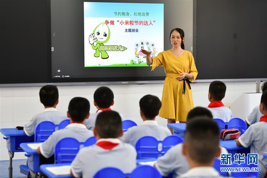 8月31日,肥西縣花崗學區中心學校新校區老師在上開學第一課“節約糧食”。 當日,新落成的安徽省肥西縣花崗學區中心學校新校區迎來了新學期的同學們。肥西縣花崗學區中心學校新校區規劃設計48個教學班,新增1000多個學位,不僅改善了昔日教室擁擠現象,還提升了校園環境。 新華社記者 劉軍喜 攝