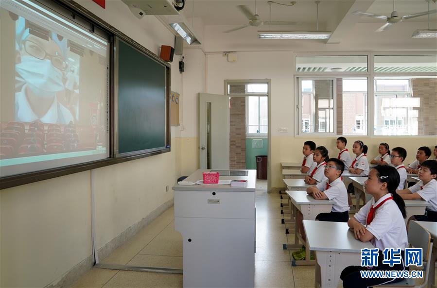 9月1日,在徐匯區徐匯實驗小學的教室內,學生們通過直播連線畫面,觀看“紅領巾”小分隊在食堂后廚的參觀體驗場景。