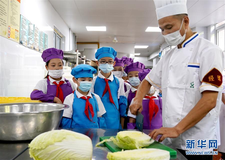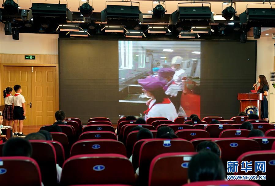 當日,上海市徐匯區徐匯實驗小學的“紅領巾”小分隊走進學校食堂后廚,參觀體驗午餐制作,了解廚師們的辛勤勞動,全校師生通過連線直播進行觀看,感受“盤中餐”的來之不易。9月1日,上海中小學生迎來新學期,多所學校將“厲行節約、反對浪費”作為開學第一課的教育主題。新華社記者 劉穎 攝