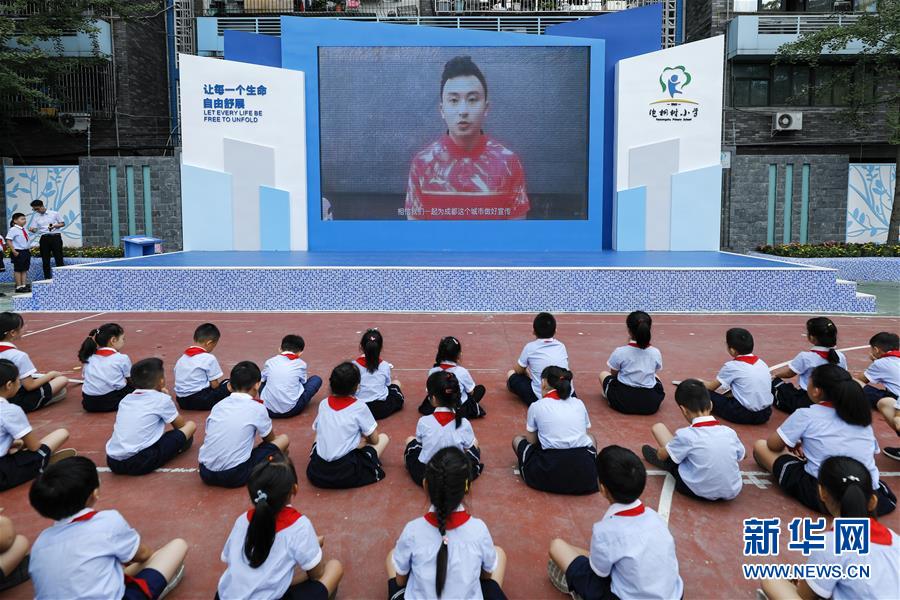 9月1日,在四川省成都市泡桐樹小學的開學典禮上,第31屆世界大學生夏季運動會形象大使、倫敦奧運會男子體操冠軍馮喆通過視頻問候師生,并鼓勵孩子們努力學習知識、積極鍛煉身體。新華社記者 沈伯韓 攝