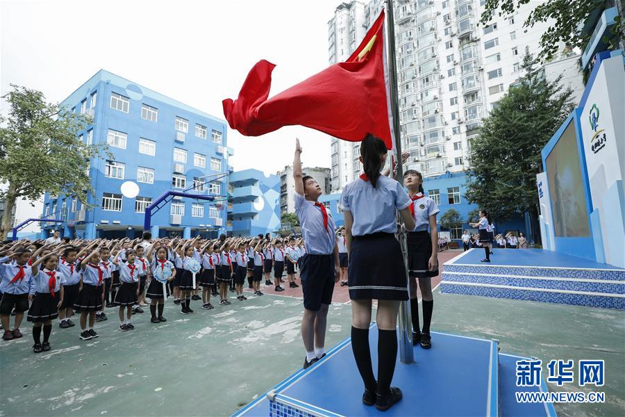 9月1日,四川省成都市泡桐樹小學學生在開學典禮上參加升國旗儀式。新華社記者 沈伯韓 攝