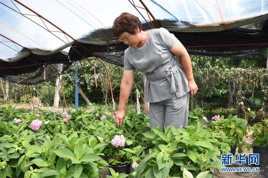 在天津市薊州區邦均鎮,苗木花卉栽植能手李淑霞在介紹自己苗圃里培育的繡球(8月25日攝)。 新華社記者 張宇琪 攝