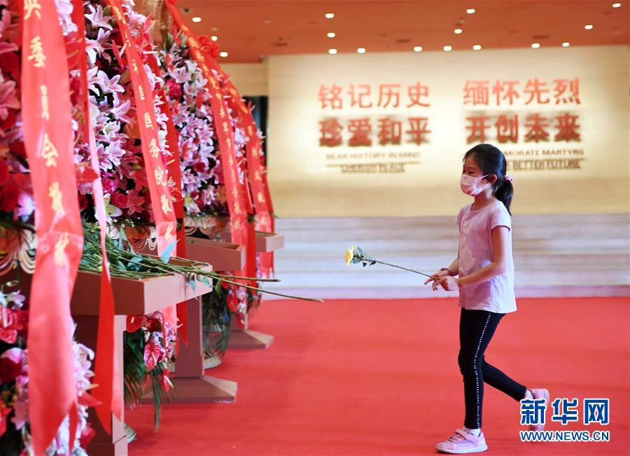 9月3日,前來參觀的小朋友向抗戰英烈敬獻鮮花。 當日是中國人民抗日戰爭暨世界反法西斯戰爭勝利75周年紀念日,許多市民來到中國人民抗日戰爭紀念館參觀,銘記歷史,緬懷先烈。 新華社記者 張晨霖 攝